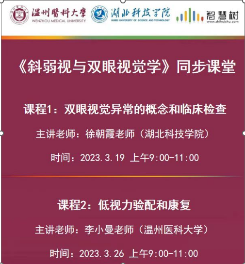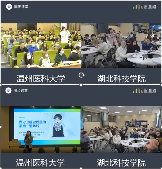 (通讯员:徐朝霞) 为深入推进教学改革创新,进一步加深校际合作交流,继3月19日我校与温州医科大学开展《斜弱视与双眼视觉学》同步课堂之后,3月26日两校再次开展第二次同步课堂教学,此次课程内容为低视力康复与验配,主讲老师温州医科大学李小曼老师与湖北科技学院徐朝霞老师一起,给同学们呈现了一堂内容丰富、互动频繁的精彩课堂。