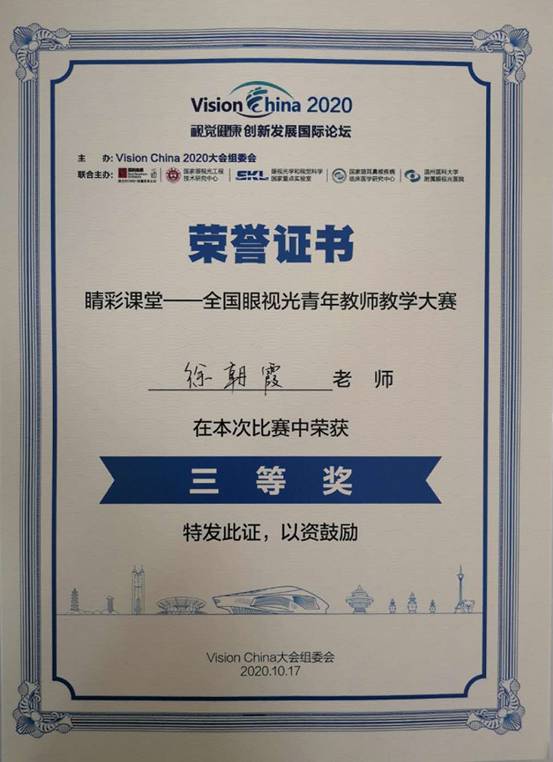 本次比赛采取“微课”形式,要求围绕1-2个知识点讲授,重点考察教学设计、实施课堂教学、评价目标达成、进行反思改进等总体能力。青年教师们聚焦“眼睛”,将日常讲课的“功力”浓缩在8分钟之内,可谓是厚积薄发、精彩纷呈。五官医学院教师代表徐朝霞参赛,以“Von Graefe测量远距离水平隐斜”为题展开讲解,幻灯制作精美,结合动画和精彩的讲解为枯燥的实践操作课堂添上一抹点“睛”之笔、打开“彩”色世界,荣获首届全国眼视光青年教师教学比赛三等奖。