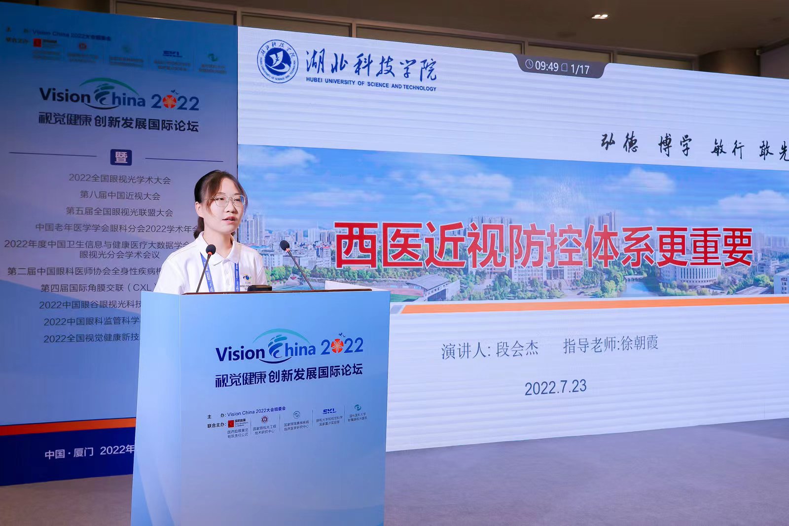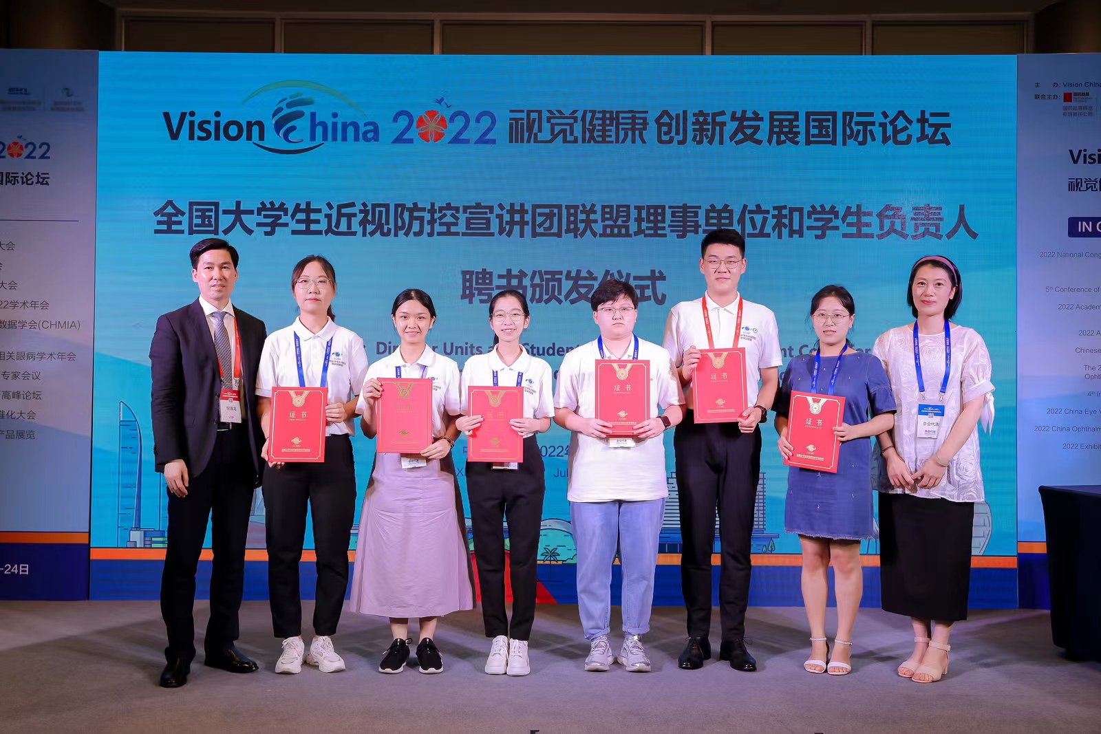 演讲完后主持人为段会杰同学颁发2022视觉健康创新发展国际论坛演讲证书。会议最后举办2022届全国综合防控儿童青少年近视大学生宣讲团联盟理事单位聘任仪式。共同呵护好孩子的眼睛,让他们拥有一个光明的未来。助力近视防控,湖北科技学院在行动!(审稿人:黄彬)