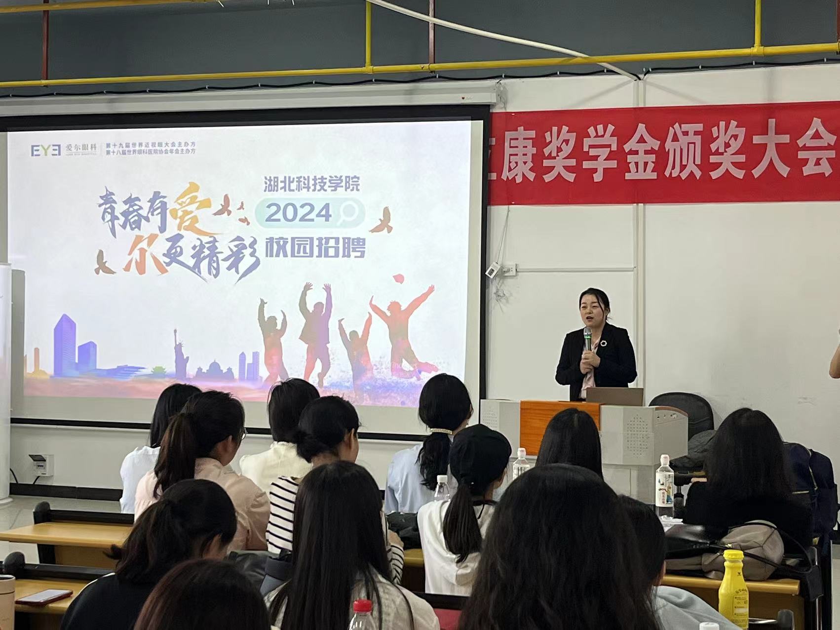 武汉爱尔眼科医院王婷婷医生以校友身份,从自身在爱尔的成长经历出发,结合医院集团发展前景,直观的向现场学生们展示了视光专业学生在爱尔眼科的成长过程,激励同学们脚踏实地,勤学上进,为同学们构筑了未来发展蓝图。