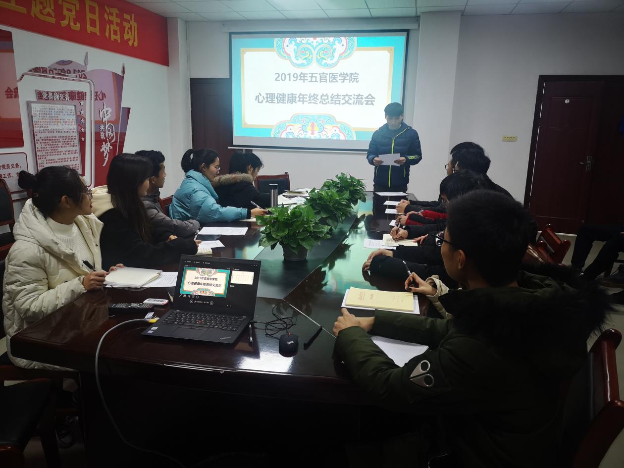 (本网讯 通讯员王艳)冬日的暖阳正悄悄爬上了枝头,金黄的落叶也随风拥抱着大地。时间如流沙,细细流逝,转眼又到了年末,为了增强心理专干预心理委员之间的沟通,提升心理委员的工作能力,五官医学院于2019年12月19日晚上7点在五官医学院五楼会议室召开心理健康年终总结交流会,会议由心理专干王艳老师主持。